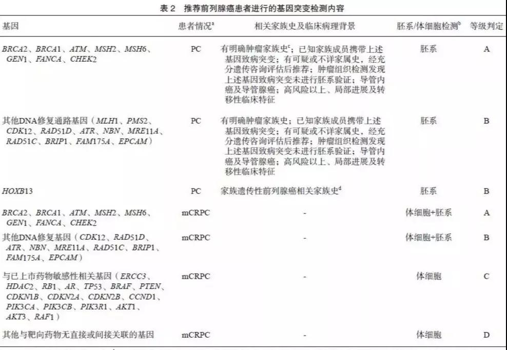 (3)对于高风险、极高风险、局部进展及转移性前列腺癌患者,推荐进行DNA修复基因(特别是BRCA2、BRCA1、ATM、MSH2、MSH6、GEN1、FANCA、CHEK2)的胚系变异检测。