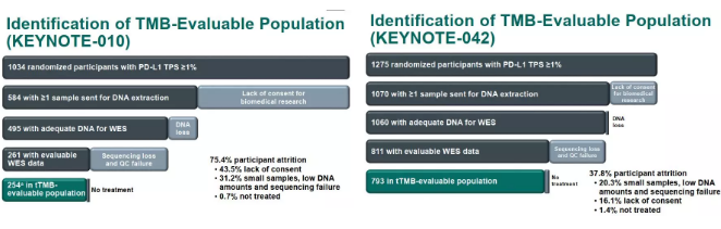 在KEYNOTE-010研究、KEYNOTE-042研究中,分别有254例、793例患者具有足够的组织DNA,并成功进行WES以评估TMB,共计253例、793例患者纳入tTMB可评估人群。