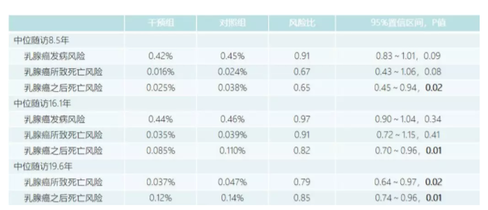 始于1991年的女性健康倡议(WHI)是全世界规模最大、随访时间最长的疾病预防研究之一,该研究共入组了超过16万例绝经后女性,研究总预算高达6.25亿美元,包括3项随机对照干预研究和1项观察研究。近日,JCO报道了其中一项饮食改善研究(WHI DM),入组了来自全美40个中心的4 8835例绝经后女性,这些入组的女性年龄介于50~79岁、无乳腺癌史、饮食脂肪摄入量占总能量≥32%,按3:2的比例被随机分为常规饮食组(n=2 9294)和饮食干预组(n=1 9541)。饮食干预目标为脂肪摄入量减少至占总能量的20%,同时增加蔬菜、水果和谷物的摄入量。通过集中复核医疗记录,确认随访期间新发生的乳腺癌。通过查询全国死亡登记数据库,计算死亡风险。主要结果见下表。