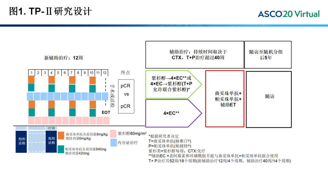 WSG-TP-Ⅱ研究入选了207例(筛选257例,40个中心)中心确诊为HR+/HER2+ EBC患者,随机接受12周标准ET(绝经前患者接受他莫昔芬,绝经后患者接受芳香化酶抑制剂,n=100)vs. 紫杉醇80mg/m2每周(n=107),所有患者接受帕妥珠单抗+曲妥珠单抗(P+T)q3w。主要终点为12周后pCR(yp T0/is/ypN0),次要终点包含安全性终点,DFS/OS,转化性研究指标。治疗12周后,所有达到pCR患者可免除进一步化疗;所有患者中,辅助治疗均给予双重HER2阻断(持续时间1年)。