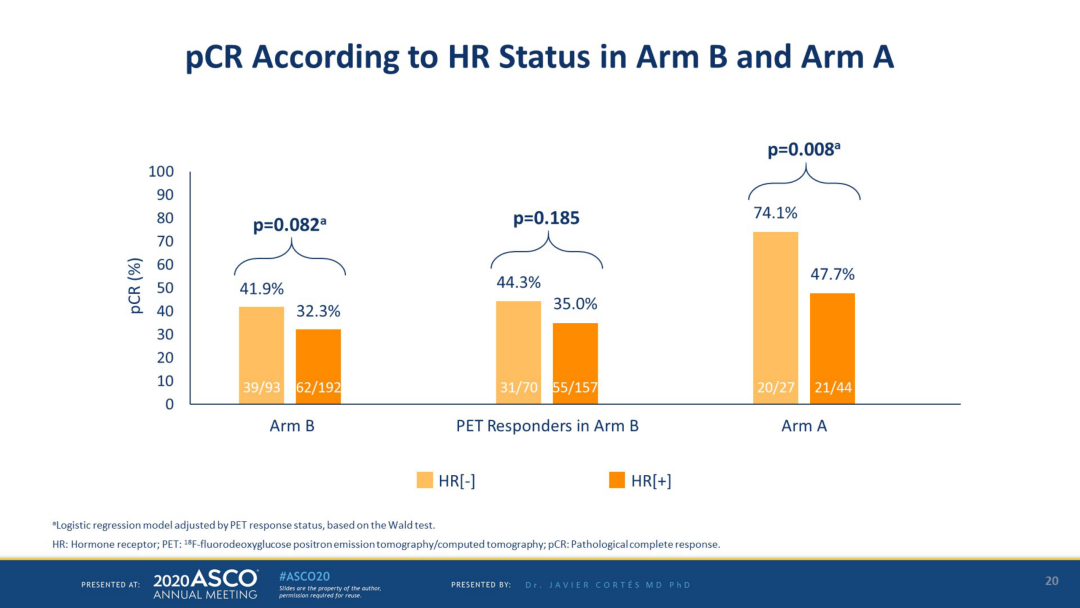 WSG TP-II是首个在HR+/HER2+ EBC中比较两种降阶新辅助方案的随机前瞻性试验,该研究提示内分泌治疗联合双靶治疗也能能够达到较好的pCR率。期待后续该研究能带来更多pCR相关数据,让患者能够免除化疗。