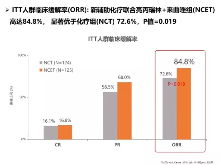 CBCSG-036研究中,249例HR+/HER2-可手术或局部晚期乳腺癌患者1:1随机分组,接受新辅助化疗或新辅助化疗+亮丙瑞林+来曲唑治疗,术后辅助治疗方案为来曲唑+亮丙瑞林(5年)。主要终点为临床缓解率(ORR),次要终点为Ki-67变化、病理学完全缓解率(pCR)、无进展生存(PFS)和安全性。处于绝经前的患者占68%,Ki-67≤20%占46%。研究发现,新辅助化疗联合内分泌组(亮丙瑞林+来曲唑)相比单纯化疗组可显著提高ORR,ITT人群的ORR分别为84.8% vs. 72.6%(P=0.019);Ki-67>20%亚组人群中,新辅助化疗+内分泌组的ORR显著提高(91.2% vs. 68.7%,P=0.001),而高临床缓解率有助于为后期手术创造有利条件。新辅助联合内分泌可显著降低Ki-67水平,ITT人群相对降低81.4%(P=0.001),而Ki-67下降与Luminal乳腺癌良好预后显著相关。Ki-67>20%亚组人群已显示PFS获益趋势,鉴于目前随访时间较短(26个月),ITT人群的PFS获益未来可期。