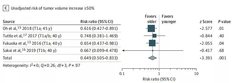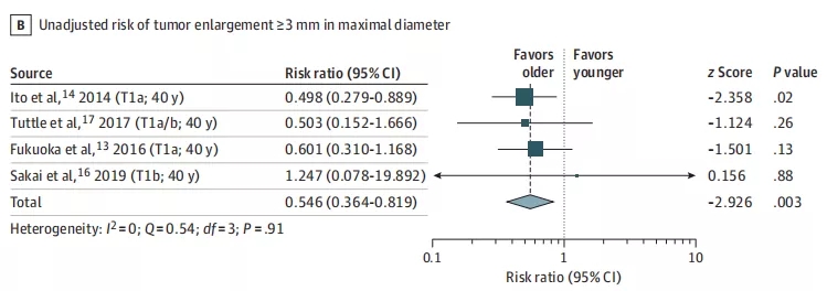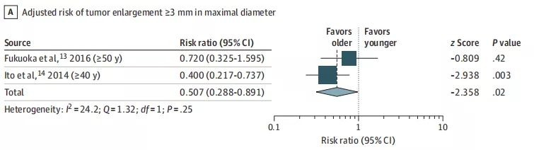 该Meta研究显示,对于低危型PTC患者而言,年龄是PTC疾病进展的保护因素,随着年龄增长,其导致最大直径增长≥3 mm或肿瘤体积≥50%的几率更低。