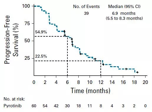 这是一项开放标签、多中心、单臂II期临床研究。共纳入中国13家研究中心。入组患者为18~75岁、组织病理学确诊的局部晚期或转移性NSCLC患者并携带HER2基因突变,患者应接受至少一种含铂双药治疗以后出现疾病进展,允许术后辅助治疗6个月内复发的患者入组,所有患者PS评分0~1分,且至少有一个可测量病灶。既往接受过针对HER2治疗的患者不允许入组,研究允许无症状脑转移的患者入组。符合入组标准的患者接受吡咯替尼400 mg/d的治疗剂量,每21天一个周期。治疗应持续进行,直至疾病进展、出现不可耐受不良反应或患者撤销知情同意。