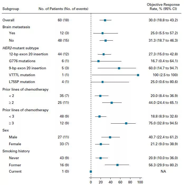从2016年10月至2018年12月,共计86例携带HER2突变的患者接受筛查,60例患者入组。患者中位年龄57岁,96.7%的患者携带远处转移,41.7%的患者既往接受过至少2种治疗方案,没有患者接受过免疫治疗。患者突变类型如下:20外显子12个碱基对插入突变(71.3%),G776突变(12%),20外显子9个碱基对插入突变(8.3%),V777L突变(1.7%),L755P突变(6.7%)。中位随访时间为11.7个月,81.7%的患者停止治疗(图1)。