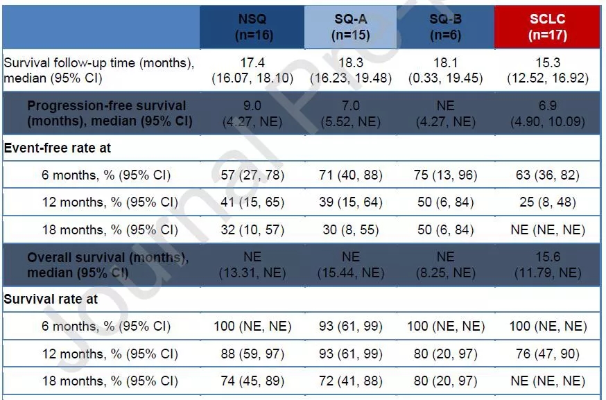 小细胞肺癌组和非小细胞肺癌组的中位随访时间分别15.3个月和18.3个月,队列1、队列2、队列3和队列4的中位PFS分别为9.0个月、7.0个月、未达到和6.9个月;18个月的PFS率分别为32%、30%、50%和未达到(图4)。