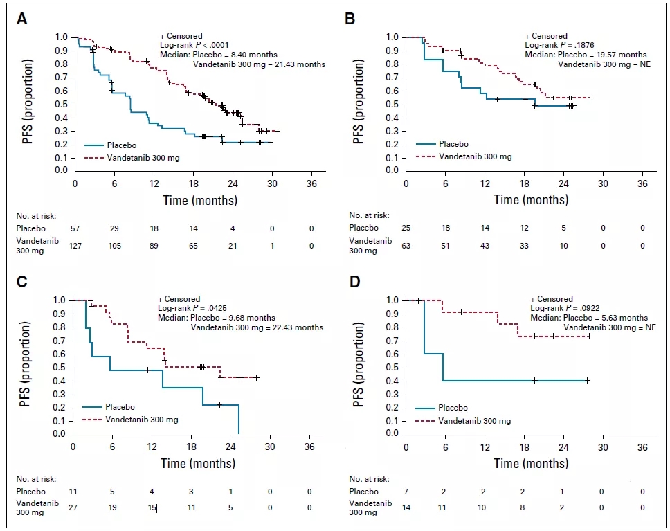 图3. MTC患者4个亚组中研究者评估的无进展生存(PFS)的Kaplan-Meier曲线(A:有进展有症状的患者;B :仅进展的患者;C:仅有症状的患者;D:无进展无症状的患者)