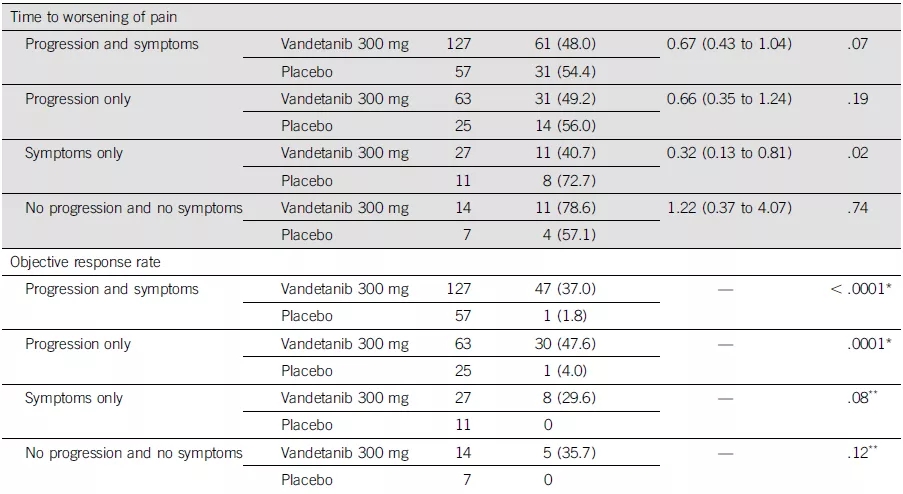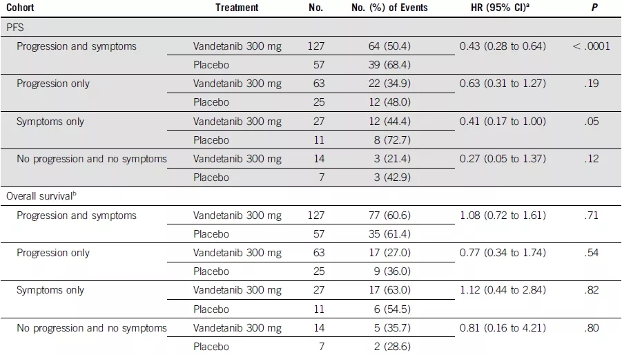 研究人员观察到,凡德他尼治疗亚组与安慰剂治疗组的ORR分别为37%和2%。凡德他尼治疗与安慰剂相比,需要减少剂量的患者更多(83例 vs. 3例)。凡德他尼治疗者的不良事件与该药物已知的安全性一致。凡德他尼组有98%患者报告至少有一次不良事件,而安慰剂组有91.9%。