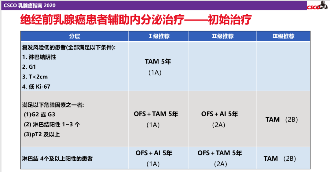 2017年的SOFT研究8年随访结果公布,证实OFS+TAM/AI能显著改善整体人群的DFS,随后SOFT/TEXT联合分析、ASTRRA研究进一步证明了这一结果并对具体人群进行了分析。基于此,2016年V2版NCCN指南、2017年V3版NCCN指南将“TAM±OFS*5年或AI+OFS*5”年作为I类证据,2020年V4版NCCN指南也将“OFS+AI/TAM*5年”作为绝经前HR+早期乳腺癌的标准治疗方案,2020版CSCO BC指南也根据患者初始治疗时的状态对其进行了分层并做出了相应推荐,对于具有高危因素患者,OFS+AI或OFS+TAM 5年治疗成为Ⅰ级推荐。