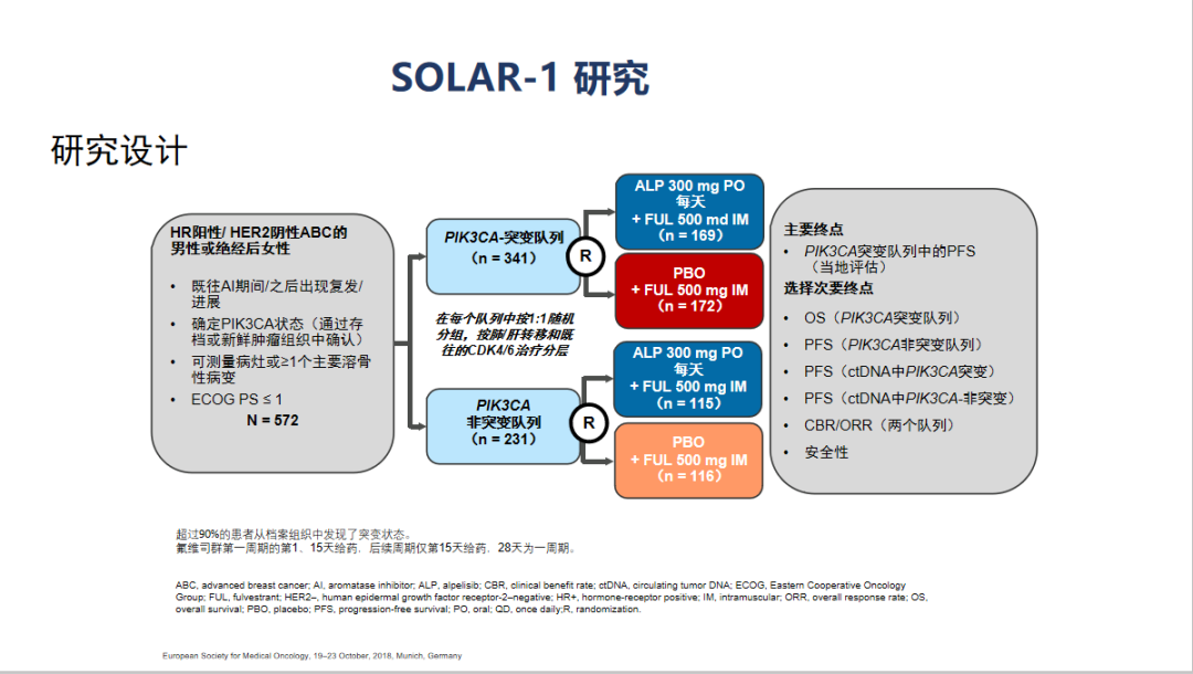 PI3K信号传导在肿瘤生长、增殖、存活中起作用,PIK3CA突变导致PI3K过度活化,会促进肿瘤细胞增殖、侵袭和转移,而在ER+/HER2-的乳腺癌中,PIK3CA基因突变的发生率则高达40%。其代表药物为Alpelisib,基于SOLAR-1全球Ⅲ期随机、双盲、安慰剂对照的试验结果,2019年FDA批准Alpelisib用于内分泌治疗耐药HR+/HER2-存在PIK3CA突变的晚期乳腺癌的治疗。