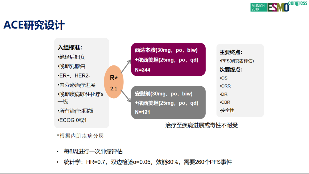 由江泽飞教授牵头的西达本胺联合依西美坦治疗激素受体阳性晚期乳腺癌的Ⅲ期临床试验——ACE研究结果显示,西达本胺联合依西美坦可以改善晚期乳腺癌患者的无进展生存期(PFS)并且安全可控,为这部分患者提供一种新的治疗选择。