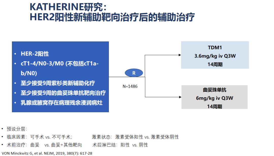 对于接受新辅助治疗未达到pCR的HER2阳性患者,KATHERINE研究进一步给出了新辅助靶向治疗后的辅助治疗策略,研究结果显示,新辅助以曲妥珠单抗为基础的靶向治疗未达到pCR患者,术后换用T-DM1可以改善患者的iDFS和DDFS,使患者在辅助治疗中从T-DM1中获益。