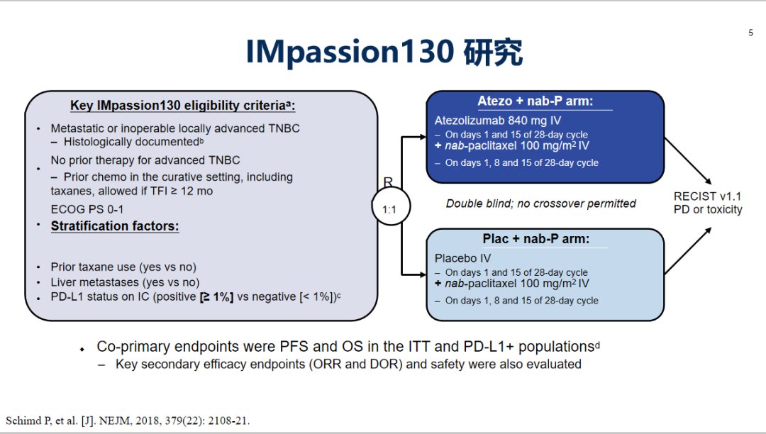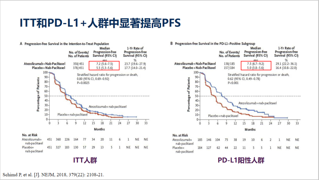 IMpassion130 研究也是免疫治疗领域的又一进展,该研究入组了902例不可手术的局部晚期或者转移性乳腺癌患者,随机(1:1)接受一线阿特利珠单抗联合白蛋白紫杉醇治疗对比安慰剂联合白蛋白紫杉醇治疗,主要研究终点包括PFS和OS。研究结果显示在ITT人群中,研究组和对照组的PFS分别为7.2个月和5.5个月;而在PD-L1阳性的患者群体中,PFS的差异更明显,研究组和对照组的PFS分别为7.5个月和5.0个月,而且都有显著的统计学差异,所以说患者PFS的获益是非常明确的。第二次OS中期分析,在PD-L1+人群中仍观察到中位OS由18个月延长至25个月(HR=0.71)。
