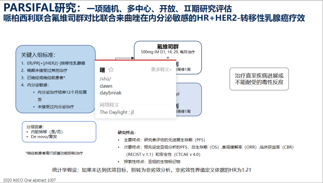 今年ASCO大会上公布的PARSIFAL研究对比了哌柏西利联合氟维司群对比联合来曲唑在内分泌敏感的HR+/HER2-转移性乳腺癌疗效,研究共入组486例患者,1:1随机接受“哌柏西利+氟维司群”或“哌柏西利+来曲唑”治疗,直至出现疾病进展或不可耐受的毒性。分层因素包括内脏累及与否以及初诊Ⅳ期或复发转移。主要研究终点PFS,次要研究终点:预设亚组分析PFS、OS安全性等。