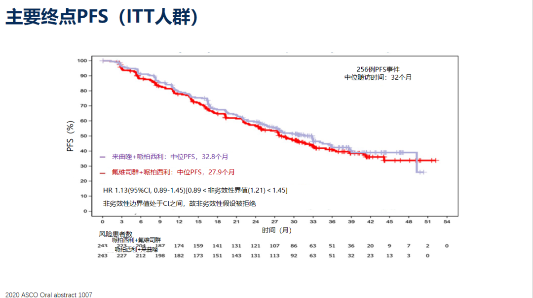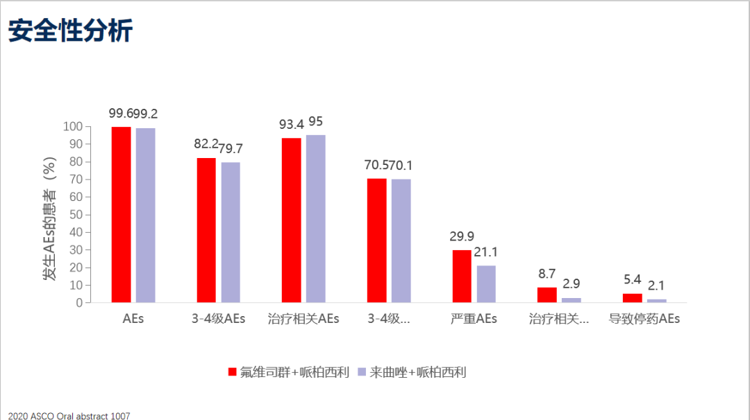 该研究提示,一线内分泌敏感晚期乳腺癌,氟维司群联合哌柏西利PFS未优于来曲唑联合哌柏西利,总生存无区别。进而提示我们单药对比的优势,不一定转化为联合的优势,甚至可能带来副反应方面的劣势。