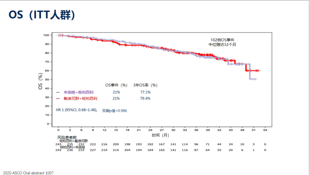 研究结果显示,中位随访32个月,256名患者出现了疾病进展,102名患者出现了OS事件。在ITT人群中,氟维司群+哌柏西利治疗患者的中位PFS为27.9个月,来曲唑+哌柏西利治疗患者的中位PFS为32.8个月(HR=1.13,P=0.321),两组患者PFS均无统计学差异。两组OS事件的发生率均为21%;预计3年总生存率,氟维司群+哌柏西利组为79.4%,来曲唑+哌柏西利组为77.1%(HR=1,P=0.986)。ORR或CBR也相当。安全性方面,3~4级不良事件的发生率两组相当。