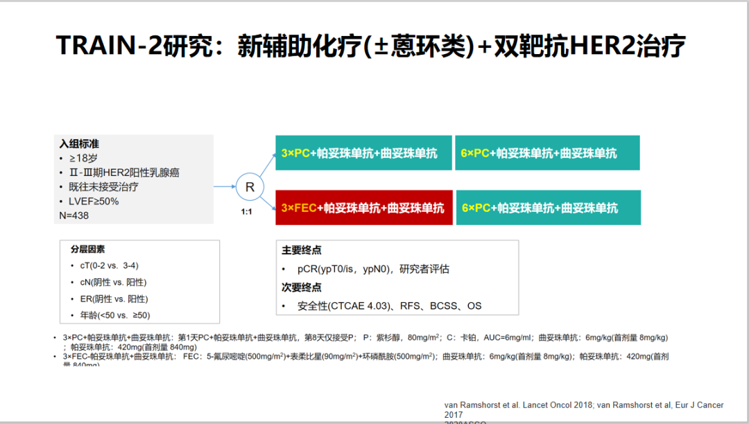 TRAIN-2研究共入组了438例患者Ⅱ-Ⅲ期、LVEF≥50%、既往未接受任何化疗且年龄大于18岁HER2阳性乳腺癌患者,并将其按照1:1随机分为两组,非蒽环组患者接受9周期紫杉醇+卡铂(P+C)+HP双靶的治疗,蒽环组患者接受3周期FEC+HP双靶,序贯6周期紫杉醇+卡铂+HP双靶的治疗,新辅助治疗之后所有患者接受手术治疗。主要终点为pCR,次要终点为安全性、RFS、OS等。