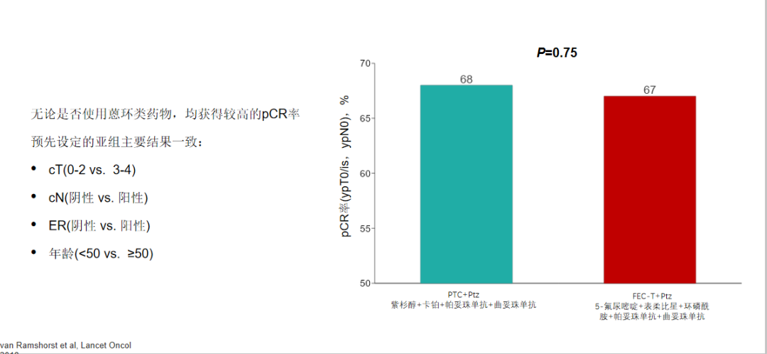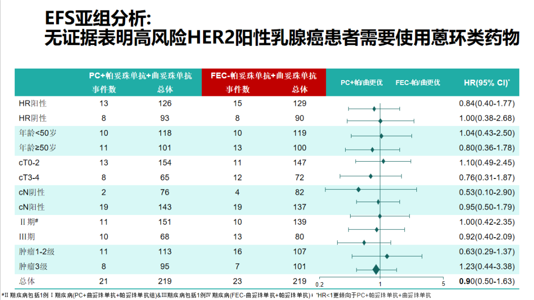 研究结果显示,无论是否使用蒽环类药物,均获得较高的pCR率,蒽环组为67%,非蒽环组68%,两组之间统计学无差异,亚组分析无论是肿瘤大小、淋巴结状态、激素受体状态、还是年龄大小、两组之间的pCR都没有看到明显的差异。3年随访结果显示,含蒽环类药物方案并未使患者EFS和OS受益。EFS亚组分析结果提示,无证据表明高风险HER2阳性乳腺癌患者需要使用蒽环类药物。安全性方面,含蒽环治疗组的患者增加发热性中性粒细胞减少症和心脏毒性风险更大,含蒽环组的患者有1%的患者出现了新发的急性白血病。此研究结果提示HER2阳性这一亚型乳腺癌,去蒽环可以考虑!
