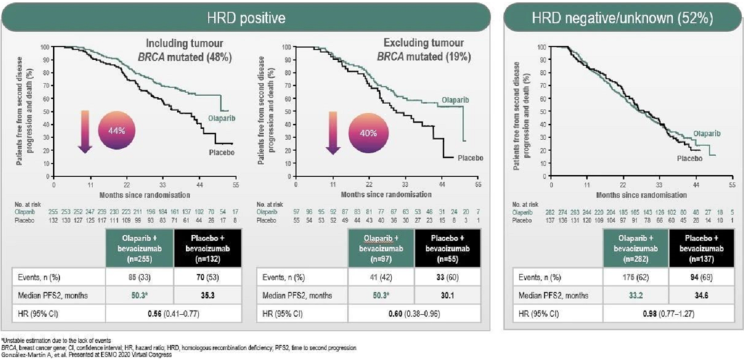 值得注意的是,在HRD阳性(包括BRCA突变)患者中,奥拉帕利治疗组的PFS2达到了50.3个月,显著高于对照组的35.3个月(HR=0.56);在HRD阳性(除外BRCAm)中,奥拉帕利治疗组也显著高于对照组(50.3 vs 30.1个月,HR=0.60)。提示HRD阳性患者的获益仍最为显著。