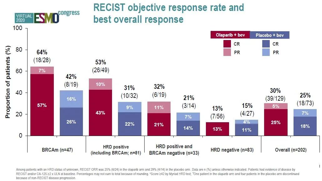 此次ESMO大会还报道了PAOLA-1研究的ORR数据。结果显示,在ITT总体人群中,奥拉帕利治疗组根据RECIST评估的ORR提高了5%(30% vs 25%),而BRCAm和HRD阳性亚组的差异更明显,分别为18%(64% vs 42%)和22%(53% vs 31%)。