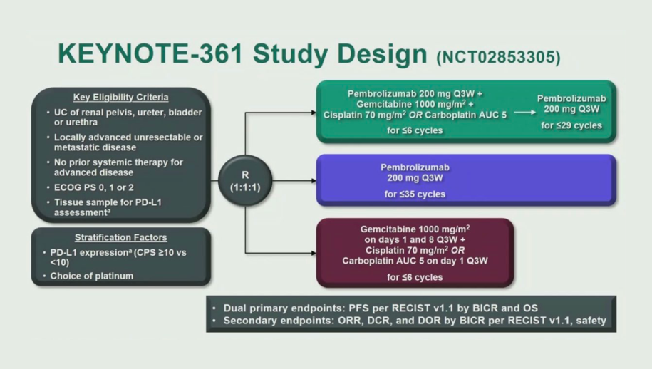 KEYNOTE-361是一项全球多中心开放标签的3期RCT研究,比较晚期尿路上皮癌应用Pembrolizumab联合化疗对比单用化疗的有效性和安全性。试验总共入组了21个国家的1010名晚期或无法手术切除的尿路上皮癌患者,其中膀胱癌占了80%,分别以1:1:1入组Pembrolizumab联合化疗、单用Pembrolizumab以及单用化疗。研究主要终点有两个,分别是PFS和OS。