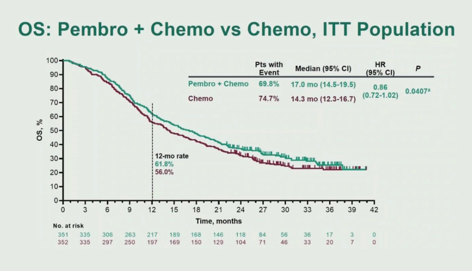 结果显示,联合治疗组、单用免疫治疗组以及单用化疗组的ORR分别是54.7%、30.3%和44.9%。在ITT人群中,这三组的PFS分别是8.3个月、3.9个月和7.1个月,OS分别是17个月、15.6个月以及14.3个月(P值均没有达到研究设计认为有统计学差异的界值)。3-5级治疗相关不良反应分别为75.1%、16.9%和71.6%。由于研究设计,单用免疫和单用化疗组无法进行是否有统计学差异的比较。