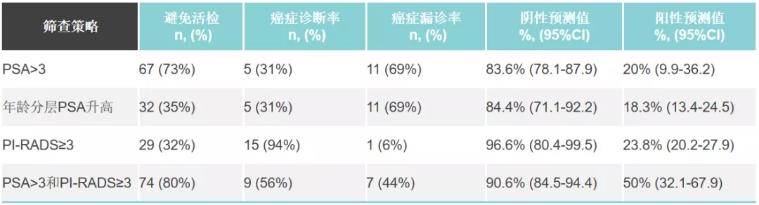 研究入组了40-70岁的男性,且携带BRCA1/2胚系突变,没有前列腺活检史。所有男性都接受包括PSA和前列腺mpMRI筛查。PSA的年龄分层阈值为:40-50岁≥1ng/mL;50-60岁≥2ng/mL;60-70岁≥2.5ng/mL;PSA升高和/或mpMRI可疑病变的男性进行前列腺活检。评估PSA水平、MRI表现、前列腺癌发生率和肿瘤特征。