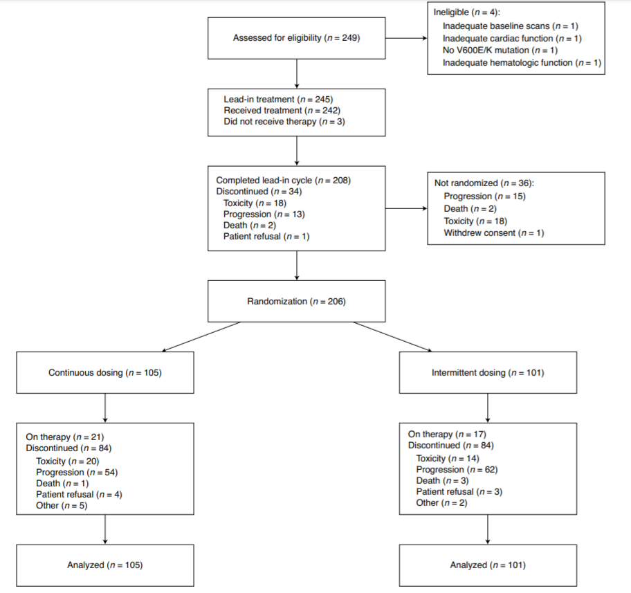 这项随机、开放标签、Ⅱ期临床试验聚焦于给药方案对获得性耐药的影响。在2014年9月19日至2019年4月16日期间,共有245例患者转移性或不可切除的BRAFV600黑色素瘤患者接受了为期8周的导入期治疗(连续BRAFi+MEKi),随后将其中206例未发生进展的患者随机(1:1)分成两组,即连续给药组(n=105)和间歇给药组(3周停药,5周给药;n=101)。