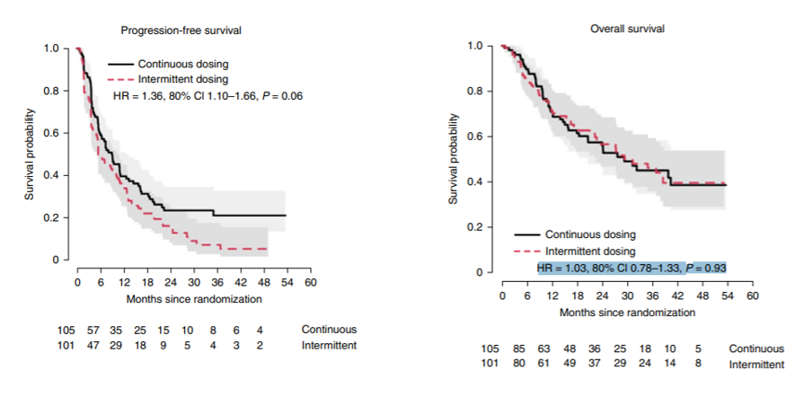 在次要终点OS方面,连续给药和间歇给药组间无显著差异(29.2 vs 29.2个月,HR = 1.03,80% Cl:0.78~1.33,P=0.93),但间歇给药组发生进展患者的总生存较连续给药组发生进展患者更好(HR=0.76,80%CI:0.78~1.00,P=0.20)。