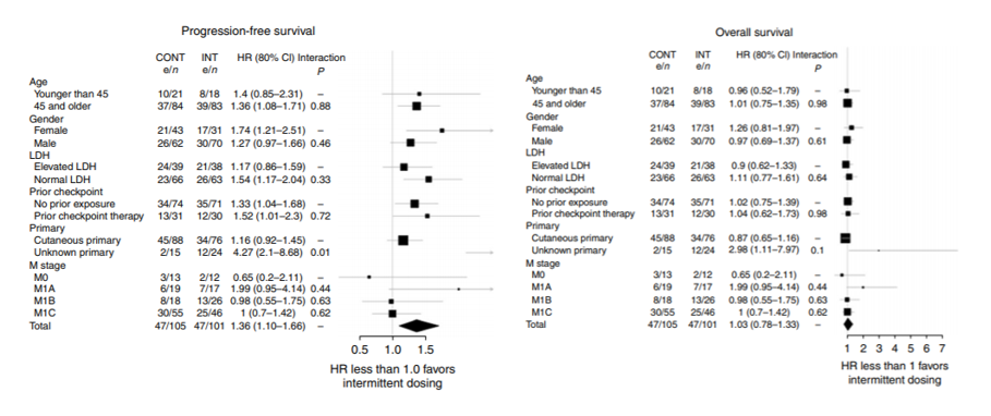 连续给药组和间歇给药组进展后的治疗率分别为50%和49%,两组分别有37%和42%的患者接受抗PD-1治疗(P=0.66),32%和26%的患者接受伊匹木单抗治疗(P=0.63)。各亚组的PFS和OS获益趋势相似。