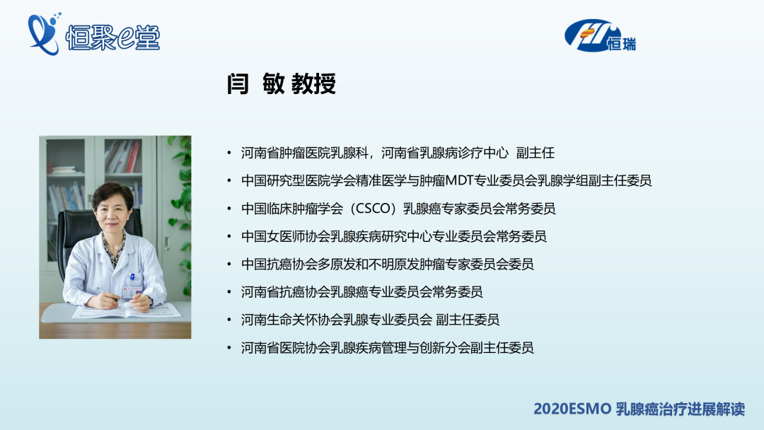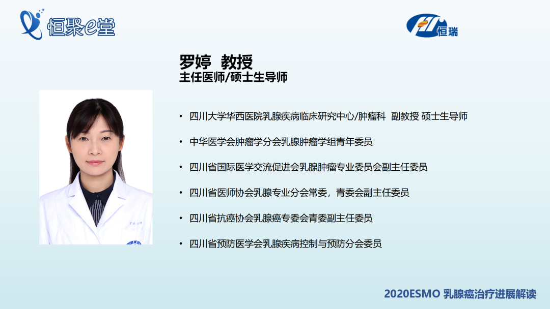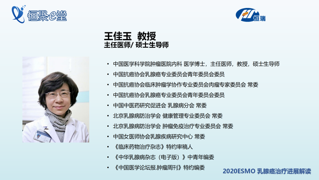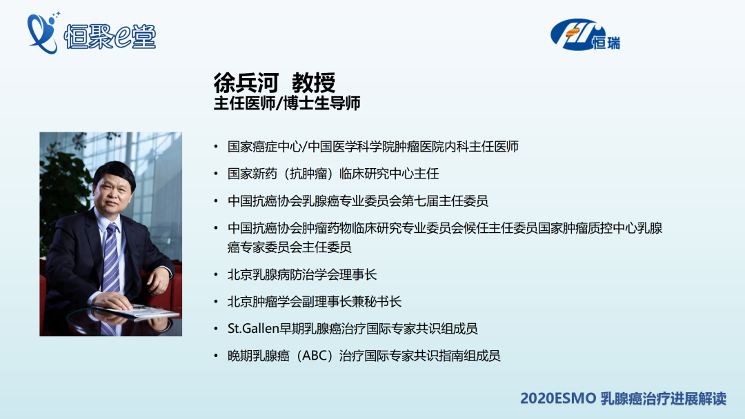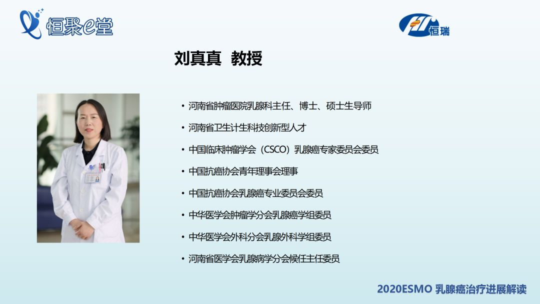 青山同路,与乳同行。2020年10月15日,来自全国各地专家再次齐聚“恒聚e堂”,共同参加由中国医学科学院肿瘤医院徐兵河教授担任大会主席的“2020ESMO乳腺癌治疗进展解读”专场,本期会议邀请了三位吡咯替尼研究的主要研究者河南省肿瘤医院刘真真教授,闫敏教授及四川大学华西医院罗婷教授讲述与解读卓越数据背后的故事,同时也邀请了中国医学科学院肿瘤医院王佳玉教授带我们一览2020年ESMO乳腺癌最新进展。会上齐聚各方观点,来自西安交通大学第一医院杨谨教授、山东大学齐鲁医院黎莉教授、中国医学大学附属第一医院石晶教授和湖南省肿瘤医院刘莉萍教授就会议相关的热点问题进行了深入的探讨,同时也带来了更多的思考。