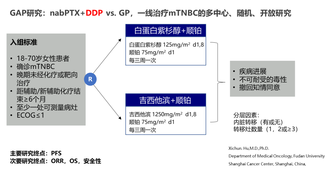 GAP研究证实,与吉西他滨联合顺铂相比,白蛋白结合型紫杉醇联合顺铂作为一线治疗改善了转移性三阴性乳腺癌患者的PFS和ORR。中位随访时间(AP vs GP): 17.8m vs 14.9m。中位PFS:9.9m vs 7.5m(HR:0.66;95%CI:0.50-0.87;P=0.004)。白蛋白紫杉醇组ORR显著更高:81.1% vs 56.3%;P<0.001。