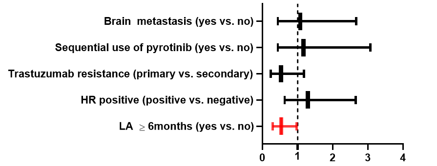 COX回归分析显示,吡咯替尼疗效与既往拉帕替尼获益是否达到6个月具有相关性,与是否脑转移、拉帕替尼进展后是否立刻换用吡咯替尼、是否赫赛汀原发耐药、激素受体表达状态等无关。