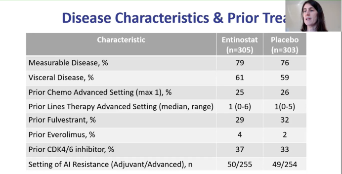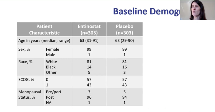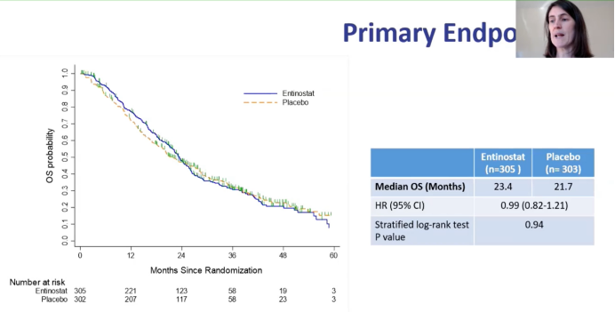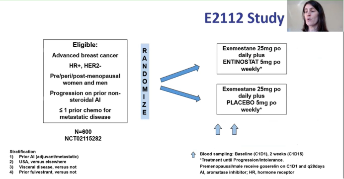 E2112是一项多中心、随机、双盲、安慰剂对照的Ⅱ期研究,纳入了HR阳性,HER2阴性、接受芳香化酶抑制剂治疗的男性或女性转移性乳腺癌患者(NCT02115282)。要求参与者的ECOG评分为0-1。疾病进展后进行化疗和氟维司群及CDK4/6抑制剂治疗的人群亦可入组。参与者每日一次口服依西美坦25 mg,每周一次口服恩替诺特(EE)或安慰剂(EP)5mg。主要研究终点为PFS和OS。为控制Ⅰ类错误,α值取单侧0.025并分配0.001和0.024作为PFS和OS的检验标准。最初360名患者的PFS风险降低了42%(中位PFS为4.1到7.1个月),把握度88.5%。所有600名患者的OS把握度为80%,死亡危险降低25%(中位OS为22至29.3个月)。次要终点包括C1D1和C1D15(整合生物标志物)之间的PBMC(CD3+T细胞,CD14+单核细胞,CD19+B细胞,泛白细胞标记CD45+细胞,CD56+NK细胞)的安全性,客观应答率(ORR)和蛋白质赖氨酸乙酰化状态的变化。