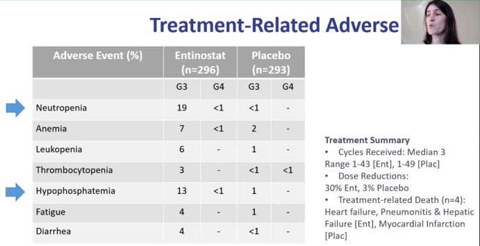 E2112试验给予依西美坦联合恩替诺特或安慰剂治疗,观察患者的PFS和OS的同时对药物安全性和耐受性进行评估,试验的详细数据我们所知有限,就ENCORE301的安全性和耐受性评估来看,并无一人因口服恩替诺特死亡。EE组中最常见的3/4级不良反应是疲劳,恶心,中性粒细胞减少,呕吐,贫血,呼吸困难,血小板减少和关节疼痛。其中又以中性粒细胞减少(EE:15%对EP:0%)和乏力(EE:13%对EP:3%)最为显著。EE组较EP组因不良事件而终止治疗的比例更高(11%vs 2%)。E2112试验是对既往内分泌治疗耐药性研究和相关药物安全性的重要补充,我们期待SABCS大会上ECOG-ACRIN癌症研究小组的详细试验数据,也希望未来HDACi类药物联合内分泌治疗可以为Luminal型复发转移乳腺癌的二线治疗提供更多选择。