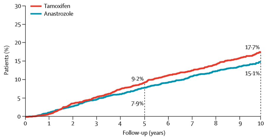 图3:HR+患者中的TTDR 10年结果(红线:他莫昔芬;蓝线:阿那曲唑)