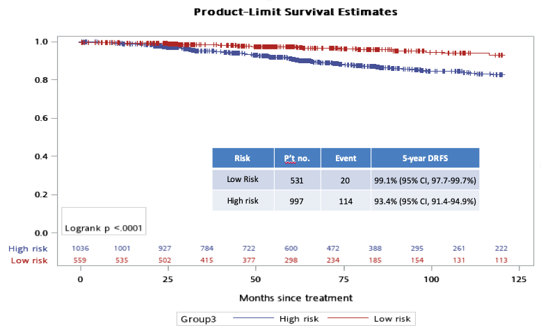 本研究采用更为“严格”标准定义临床低危HR+/HER2-乳腺癌患者的术后5年DRFS率达到99%以上,提示这些患者的疾病本身预后较好,可能很难从多基因检测辅助化疗决策中获益,本结论有待进一步研究验证。