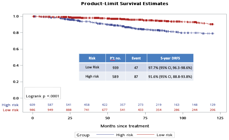 我们对2972例HR+/HER2-早期乳腺癌患者进行预筛,1528例患者符合入组标准(表1),其中859例(56.2%)接受了术后辅助化疗。标准1定义的临床低危和高危患者分别为531例(34.8%)和997例(65.2%);标准2定义的临床低危和高危患者分别为939例(61.5%)和589例(38.5%)。总体上,标准1定义的临床低危与高危患者之间的5年DRFS存在显著统计学差异(99.1% vs 93.4%,P<0.0001,图1);标准2定义的临床低危与高危患者之间的5年DRFS存在显著统计学差异(97.7% vs 91.6%,P<0.0001,图2)。按是否接受过术后辅助化疗进行亚组分析:标准1定义的低危患者5年DRFS分别为99.2%和99.1%,标准2定义的低危患者5年DRFS分别为97.5%和97.9%,化疗组与未化疗组相比均未达到显著统计学差异(图3-4)。