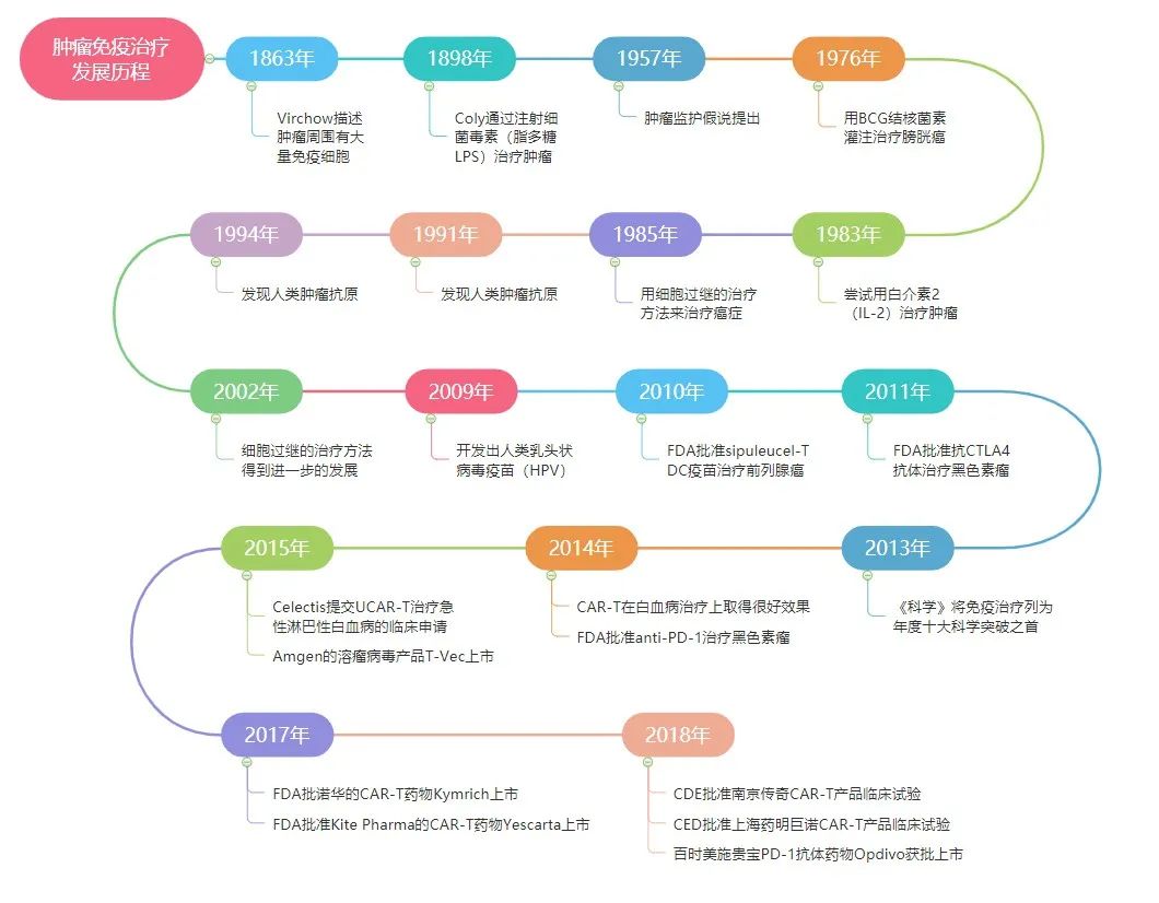 最早的肿瘤免疫治疗可以追溯到1893年,纽约骨科医生William Coley发现骨肉瘤患者在手术切除肿瘤后被化脓性链球菌感染能够导致癌症消退,这是感染促进免疫反应从而治愈癌症的实例,从而创立了“科利毒素”疗法。
