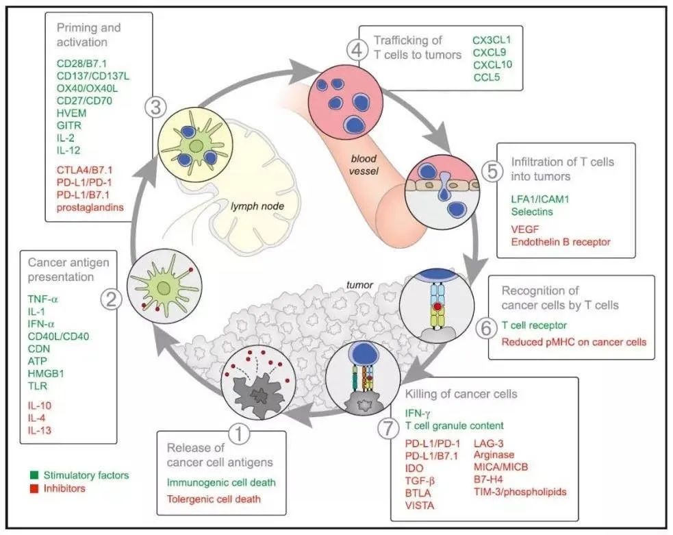 免疫系统清除肿瘤是一个动态的过程,首先肿瘤形成所产生的新抗原专职的抗原呈递细胞如树突状细胞(DCs,免疫细胞的一种)释放并捕获且进行处理,且DCs启动表达MHC-1和MHC-2(主要组织相容性复合物1和2),将抗原呈递给效应T细胞,从而激活效应T细胞启动对癌症特异性抗原的处理,激活的效应T细胞通过其T细胞受体(TCR)与MHC-1结合的同源抗原相互作用,转运至并浸润到肿瘤床,特异性识别并与癌细胞结合,杀死靶癌细胞。