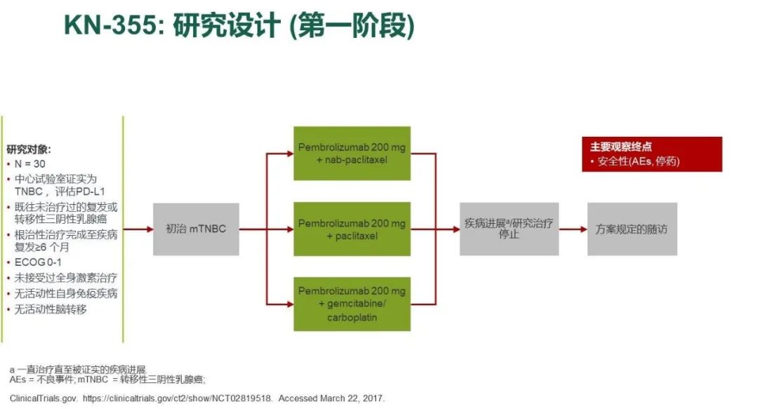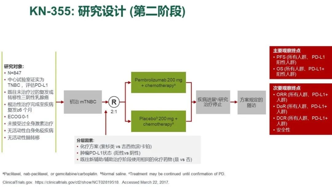 [5] Randomized, Double-Blind, Phase III Study of Pembrolizumab (MK-3475) Plus Chemotherapy vs Placebo Plus Chemotherapy for Previously Untreated Locally Recurrent Inoperable or Metastatic Triple Negative Breast Cancer(KEYNOTE-355)( https://clinicaltrials.gov/ct2/show/NCT02819518)
