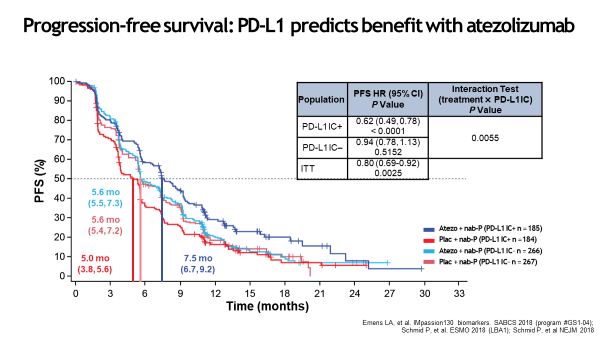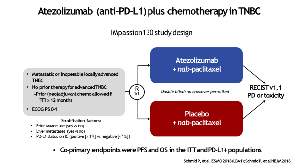 说完了PD-1再来说说PD-L1在TNBC中的表现,可称之为加速推动TNBC分子分型进程的atezolizumab的Impassion130研究[7]在2018年ESMO重磅公布。