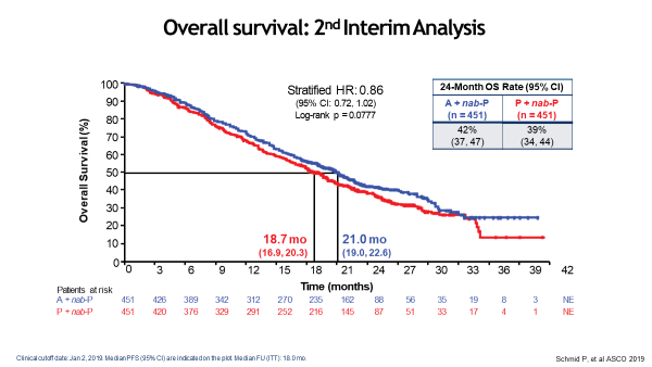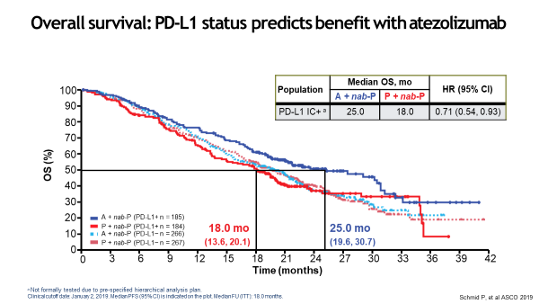 在2019年ASCO上公布的OS二次分析结果,ITT人群中位OS治疗组与安慰剂组对比为20.0个月比18.7个月,PD-L1+亚组人群则为25.0个月比18.0个月,提示PD-L1 IC状态可以预测atezolizumab联合白蛋白紫杉醇的临床疗效,由于既往TNBC患者中位OS≤18个月,所以此联合方案作为首个跨越2年里程碑OS获益的治疗方案,为PD-L1+mTNBC的一线治疗奠定了新基准。