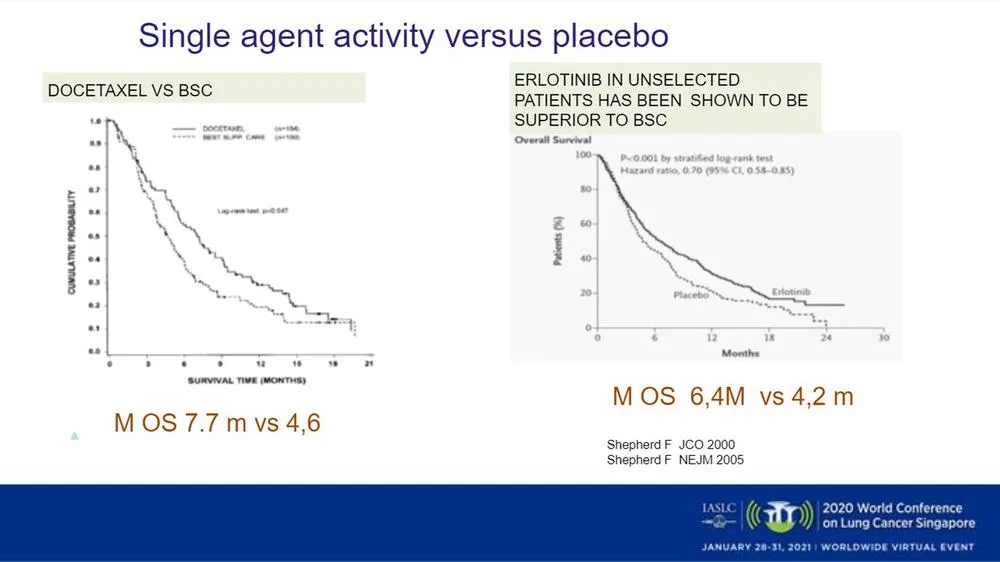 二线多西他赛或EGFR-TKI:较早的试验比较了二线多西他赛和支持治疗,结果显示多西他赛带来有统计学意义的获益,中位总生存期(OS)为7.7个月。同样一项试验显示,在未选择患者中,厄洛替尼相比支持治疗增加一些OS获益(图1)。8,9另一项试验比较了厄洛替尼和多西他赛,二线多西他赛治疗有获益趋势,但二者治疗鳞状细胞癌患者的活性相似。10