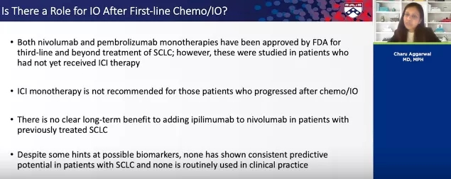 Aggarwal博士说:“免疫检查点抑制剂单药治疗不推荐用于免疫化疗后进展的SCLC患者,尽管存在一些可能的生物标志物,但没有一个标志物在SCLC患者中显示出一致的预测效力,目前没有一个标志物被常规应用于临床实践。”