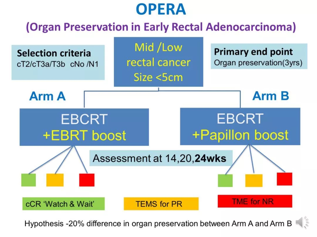OPERA是一项正在欧洲进行的多中心、随机、开放标签的Ⅲ期临床试验,旨在确定X线近距离放射治疗(CXB)是否提高器官保留的可能性(NCT02505750),研究设计见图1。所有患者均接受标准的新辅助化疗加同步外放射治疗(EBRT),随后采用CXB(试验组)或EBRT(对照组)进行放疗增强。24周后无临床完全缓解的患者根据残留疾病的程度进行TME或局部切除,而达到完全缓解的患者则接受监测,并在发生局部再生时进行手术。