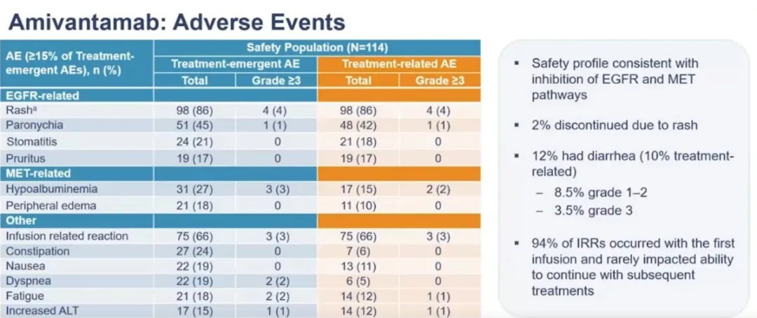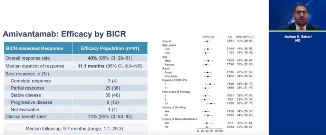 所有患者均接受Amivantamab治疗。体重<80kg的患者接受1050 mg剂量,体重≥80 kg患者的剂量为1400 mg。中位随访9.7个月后: