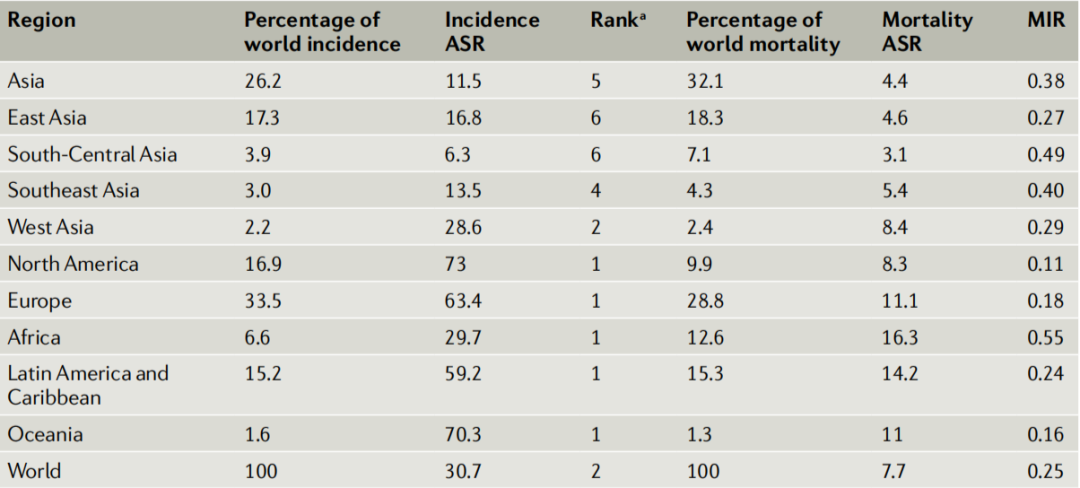 表1. 2020年亚洲各地及其他大洲的前列腺癌发病率和死亡率