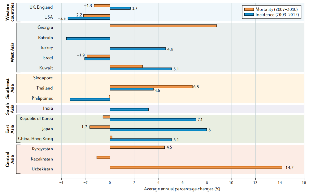 图1. 部分亚洲国家和英美的前列腺癌发病率和死亡率年均百分比变化(AAPC)