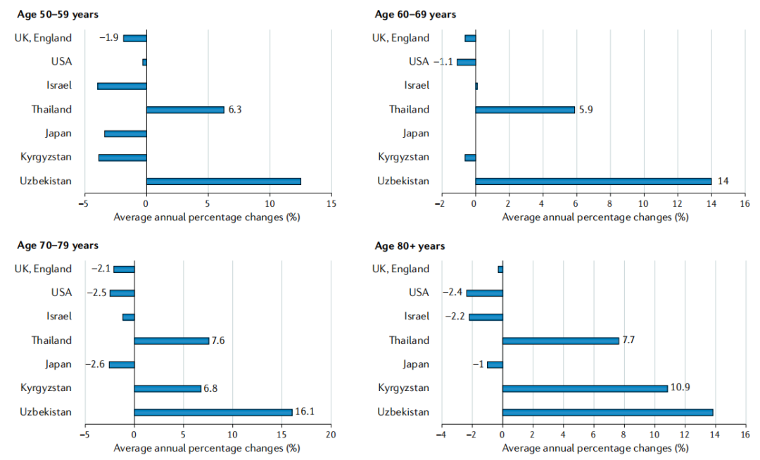 发病率和死亡率趋势——目前,亚洲国家中仍缺乏高质量的发病和死亡登记数据。我们根据现有数据评估了亚洲国家的前列腺癌流行趋势发现,韩国、科威特和中国香港的发病率有所上升,但死亡率稳定;日本和以色列的死亡率均有所下降,但相比之下,泰国、乌兹别克斯坦和哈萨克斯坦报告的死亡率有所上升(图1)。此外,日本和以色列的老年前列腺癌死亡率(日本70-79岁男性:AAPC=-2.6,P<0.01,以色列80+岁男性:AAPC=-2.2,P<0.01)有显著下降,与美国同期的趋势相似;而泰国、乌兹别克斯坦等国家则相反(图2)。这些差异可能与发展中国家及发达国家的PSA筛查、药物可及性相关。